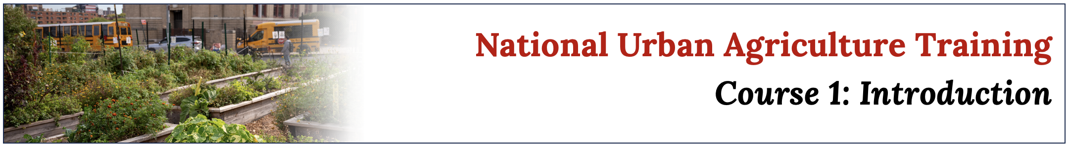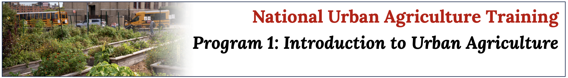 You are currently enrolled in the first of two programs that comprise the National Urban Agriculture Training. This program is called "Program 1: Introduction to Urban Agriculture" and consists of six courses. After completing these courses, you will be enrolled in a Zoom session hosted by training instructors and urban growers. Following the Zoom session, you will be enrolled in "Program 2: Urban Agriculture Application," which consists of four courses. Navigate to "Course 1: Introduction" for more information and to get starter. Welcome!