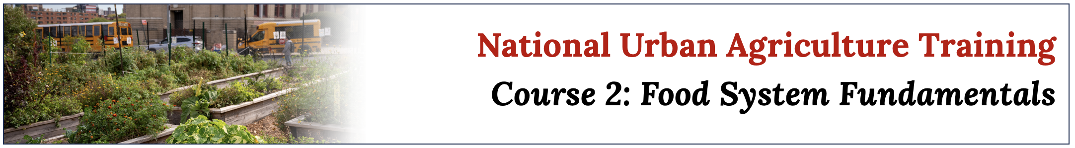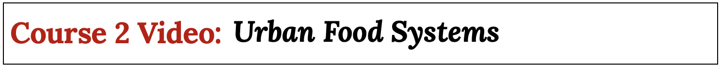Course 2 Video: Urban Food SystemsSystems can be examined at different scales and locations. This video explores food systems from the perspective of urban consumers and markets. As you watch this video, think about how your behavior may influence and support urban food systems.This section also introduces the urban farmer educators who contributed to this training. -