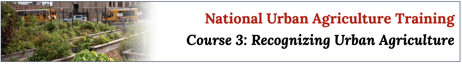 Course 3: Recognizing Urban Agriculture will provide examples of how urban agriculture is practiced so you can recognize it when you see it. To do this, we’ll explore the following topics: