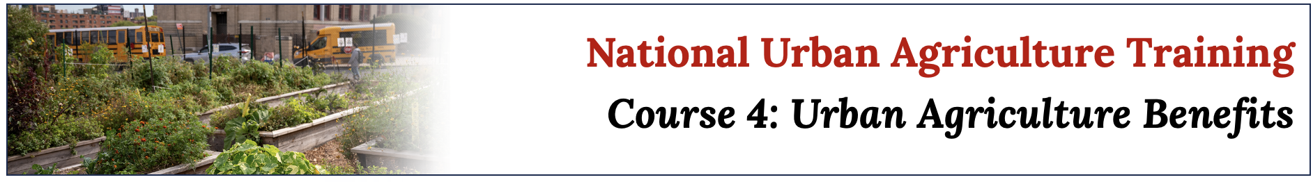 Course 4 Video: Course 4 Recap and Next StepsThis video wraps up Course 4. Course 4 explored the variety of benefits provided by urban agriculture and how those benefits inform urban grower decision-making. Urban growers often maximize multiple benefits of urban agriculture because of the range of needs and desires expressed by their communities and customers. It is important to be familiar with the benefits of urban agriculture and innovative production and how they interact before considering how to scale the practices and approaches that maximize these benefits.You must watch all videos to receive credit for this course. You can download the script for this video for your reference.