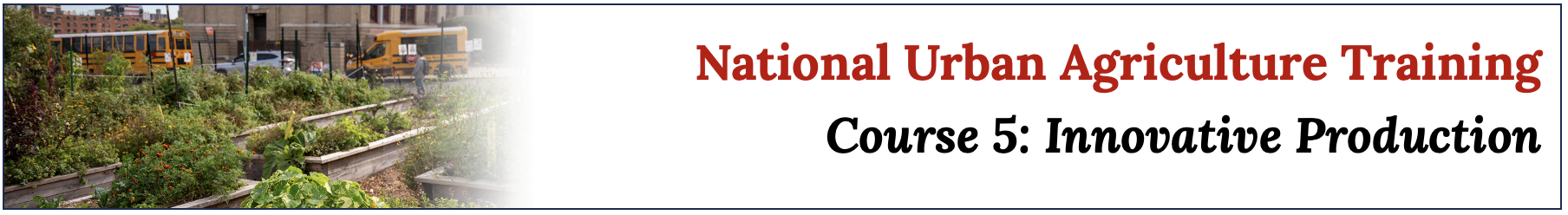 While there is no one definition of “innovative production,” in this training we will assume a definition of innovative that means to “make changes in something established, especially by introducing new methods, ideas, or products." This course explores some of the innovative production practices you are most likely to encounter in urban areas. We will briefly review soil-based, non-soil-based, and animal agriculture before illustrating specific examples of innovative production that may fall within, or span across, these typologies. In this course, we will examine the following approaches to innovative production: