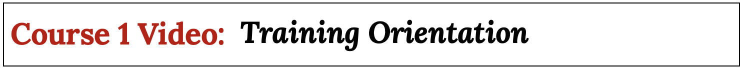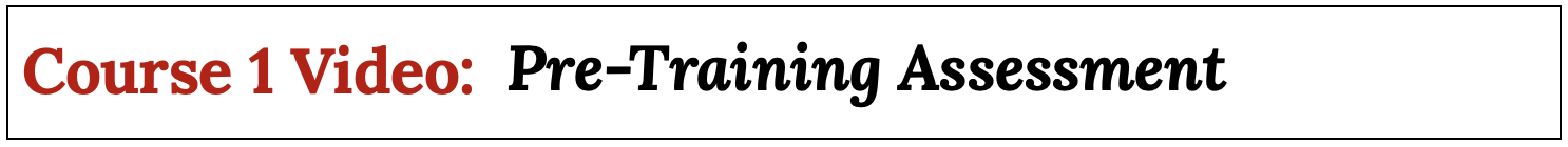 Course 1 Video: Pre-Training AssessmentWe’re almost ready to jump into content! Before we get started, it’s important for every participant to complete a pre-training assessment.There are no wrong answers to this assessment; please just answer as best as you can.