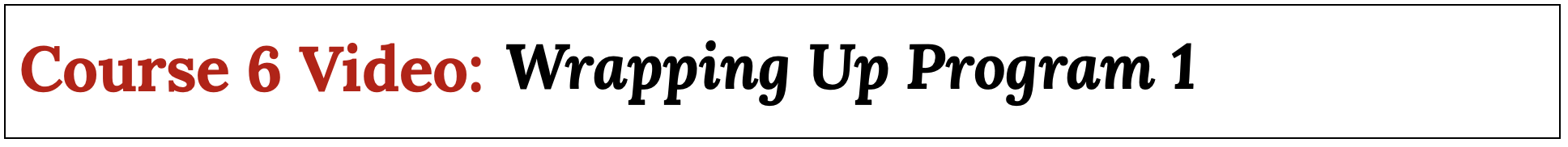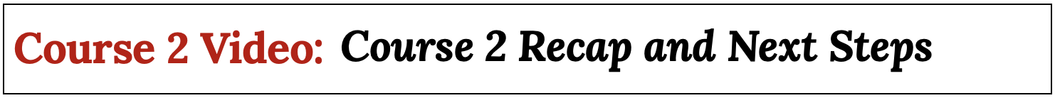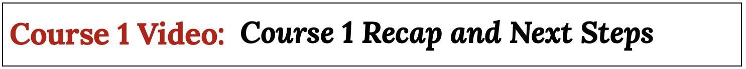 This video recaps everything we've covered and prepares you for your final Course 1 assignments.You must watch all videos to receive credit for this course. You can download the script for this video for your reference.Note: Video is placeholder only for now -