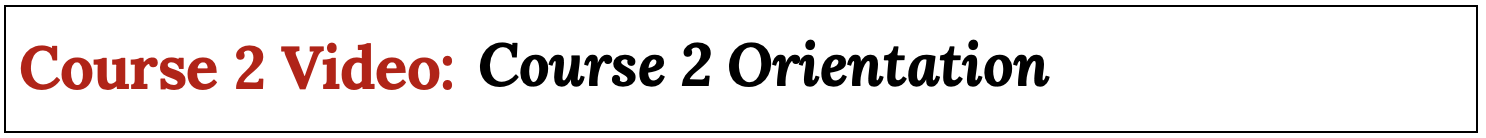 Course 2 Video: Course 2 OrientationThis video provides an overview of the topics covered in this course, including learning objectives.You must watch all videos to receive credit for this course. You can download the script for this video for your reference.You can download any slides shared in this video at the beginning of the course, or in the "Additional Resources" section at the end of this course.Note: Video is placeholder only for now -