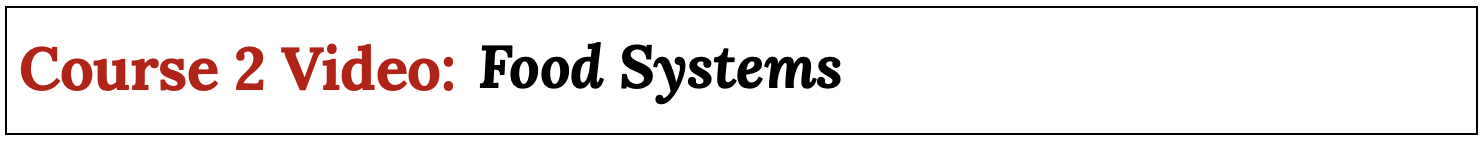 Download and complete the “Course 2 Food Systems Action Plan” template. This template is designed to help you process your learnings from this course and turn those learnings into action. We will not ask you to submit this action plan to us, but are happy to discuss it during the Zoom session.