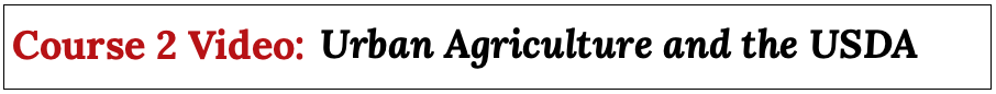Course 2 Video: Urban Agriculture and the USDAThe USDA has participated in the history of urban agriculture in various ways since the late 1900s. This video explores this history. As you watch, think about how this history contextualizes your perceptions of urban agriculture and how you, as a USDA employee, can support urban growers.