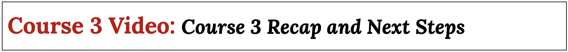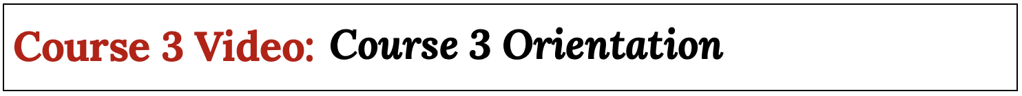 Course 3 Video: Course 3 OrientationThis video provides an overview of the topics covered in this course, including learning objectives.You must watch all videos to receive credit for this course. You can download the script for this video for your reference.You can download any slides shared in this video at the beginning of the course, or in the "Additional Resources" section at the end of this course.Note: Video is placeholder only for now -