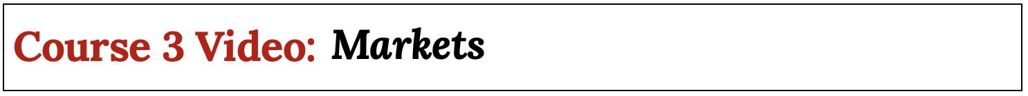 Course 3 Video: MarketsHow a farmer grows, how much they grow, and what they grow depends on the ultimate end use, or market, for a crop. This video will explore commercial markets, non-commercial markets, and hybrid markets in the context of urban production.You must watch all videos to receive credit for this course. You can download the script for this video for your reference.You can download any slides shared in this video at the beginning of the course, or in the "Additional Resources" section at the end of this course.Note: Video is placeholder only for now -