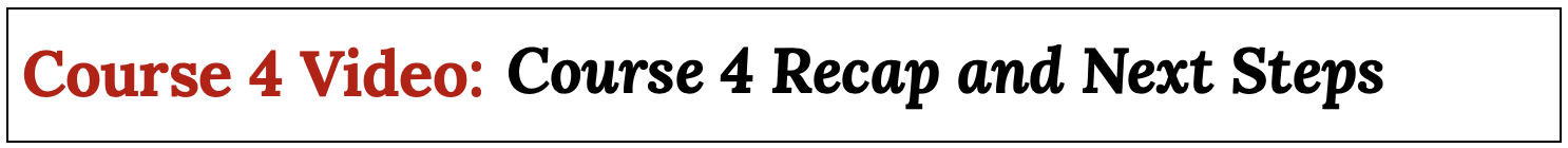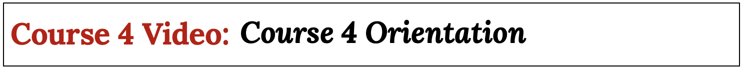 Course 4 Video: Course 4 OrientationThis video provides an overview of the topics covered in this course, including learning objectives.You must watch all videos to receive credit for this course. You can download the script for this video for your reference.You can download any slides shared in this video at the beginning of the course, or in the "Additional Resources" section at the end of this course.Note: Video is placeholder only for now -