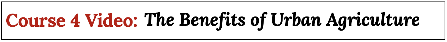 Download and complete the “Course 4: Urban Agriculture Benefits Action Plan ” template. This template is designed to help you process your learnings from this course and turn those learnings into action. We will not ask you to submit this action plan to us, but are happy to discuss it during the Zoom session.