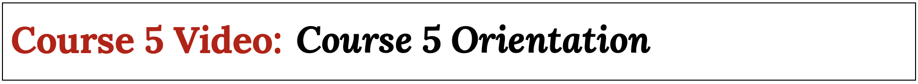 Course 5 Video: Course 5 OrientationThis video provides an overview of the topics covered in this course, including learning objectives.You must watch all videos to receive credit for this course. You can download the script for this video for your reference.