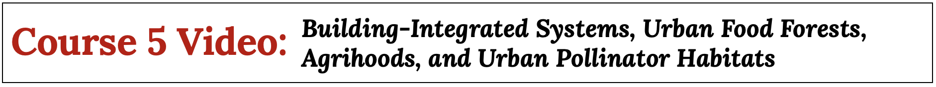 Course 5 Video: Building-Integrated Systems, Urban Food Forests, Agrihoods, and Urban Pollinator HabitatsThis video explores additional innovative production techniques you may encounter in urban areas. These include optimizing agricultural systems for integration with buildings, like rooftop farms and indoor growing operations. This video also describes community-scale urban agriculture projects, like urban food forests and agrihoods, as well as innovative land-use approaches like the creation of pollinator habitats in urban spaces.You must watch all videos to receive credit for this course. You can download the script for this video for your reference.