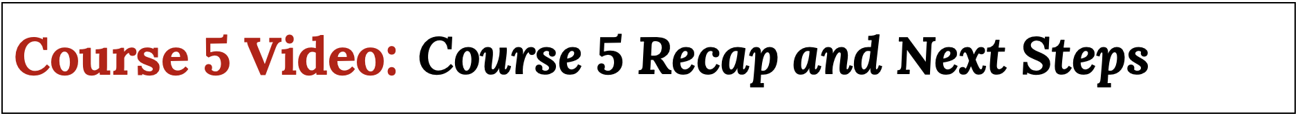 Download and complete the Course 5 Action Plan template. This template is designed to help you process your learnings from this course and turn those learnings into action. We will not ask you to submit this action plan to us, but are happy to discuss it during the Zoom session.