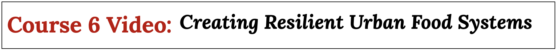 Course 6 Video: Creating Resilient Urban Food SystemsThis video reviews the material we've covered throughout Program 1, explores how urban agriculture contributes to more resilient food systems, and considers how more resilient food systems can help us address modern "wicked problems."You must watch all videos to receive credit for this course. You can download the script for this video for your reference.